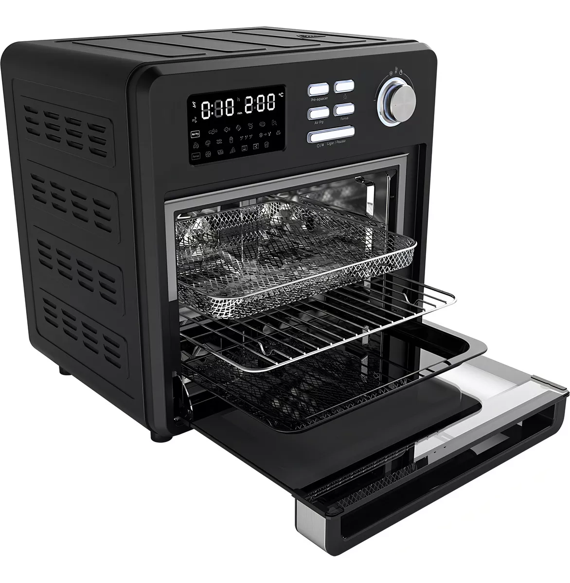 - Multifunções: Escolha entre 10 funções manuais, incluindo Fritadeira, Grill, Desidratar, Descongelar, Reaquecer, Forno, Grelhar, Turbo Convection, Torrar e Estufa.